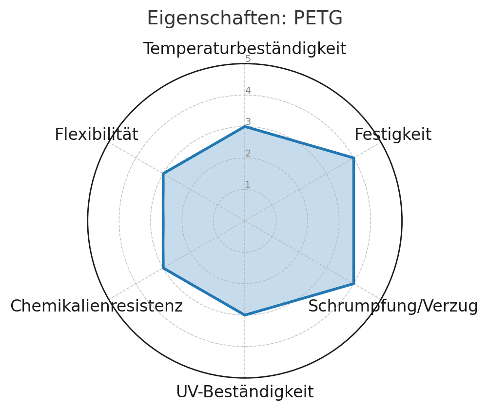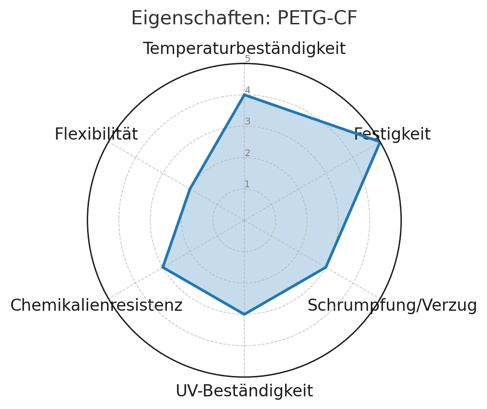 Kombiniert die Zähigkeit und Chemikalienbeständigkeit von PETG mit der zusätzlichen Steifigkeit der Kohlefasern. Perfekt für mechanisch belastbare Bauteile, die sich nicht verziehen sollen. Sehr gute Wahl für Outdoor-Anwendungen.