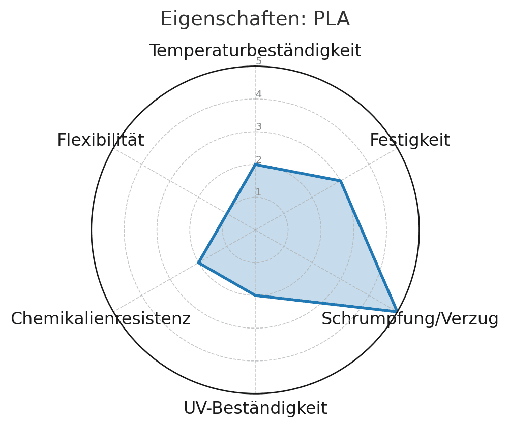 Leicht zu drucken wie normales PLA, aber durch die Kohlefaser-Zusätze deutlich steifer und stabiler. Ideal für funktionale Teile, die hohe Formstabilität benötigen. Weniger Verzug, aber spröder als Standard-PLA.